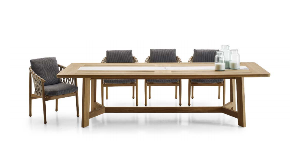 Explore our material library: teak, aluminum, rattan, rope, showrooms over 3,000 m².