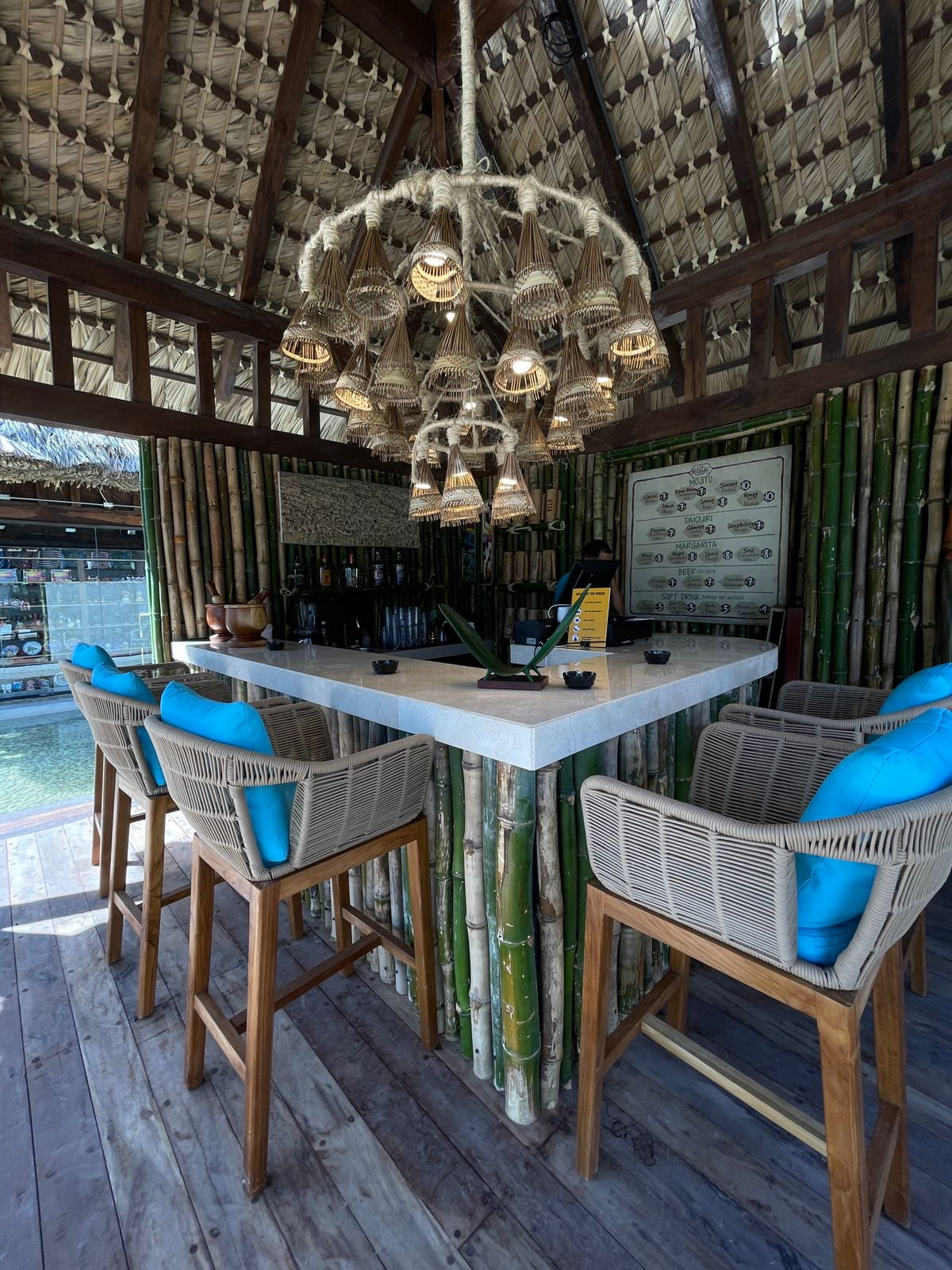 This is an outdoor restaurant in Dominica. They bought outdoor lounge beds, outdoor dining tables and chairs from our company.