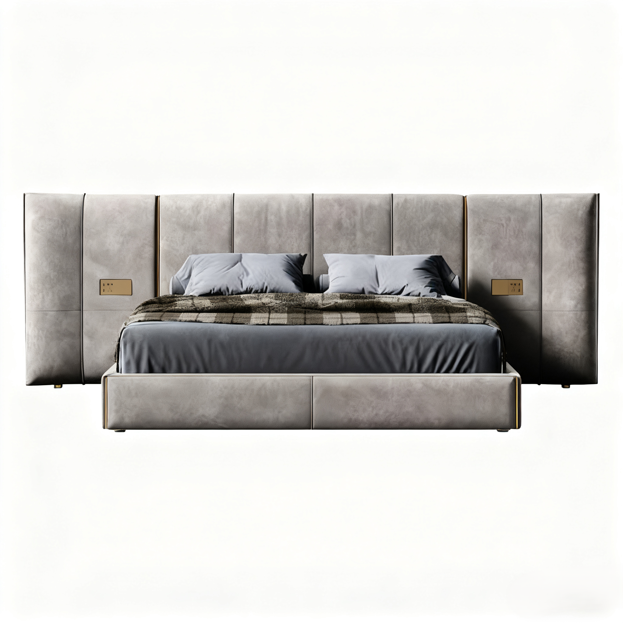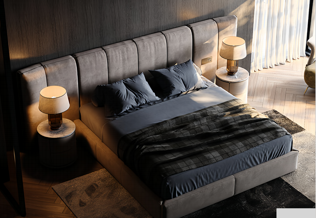 Luxury Grey Upholstered Bed with Built – in Electrical Sockets