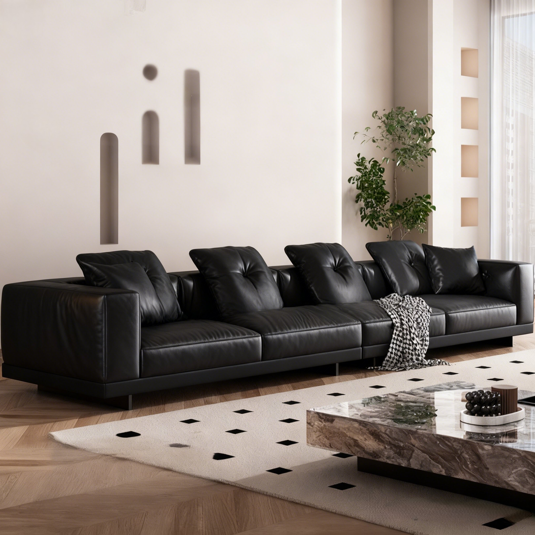 This black leather modular sofa interprets modern luxury with a minimalist design style. The high – quality leather is delicate and durable to the touch. Tufted pillows and a checkered throw add detailed texture. The modular structure can be flexibly combined to fit different spatial layouts. Whether creating a minimalist or light – luxury living room, it can become the visual focal point of the space, injecting a sense of high – level and comfort into the home environment, making it an ideal choice for those pursuing a quality life.
