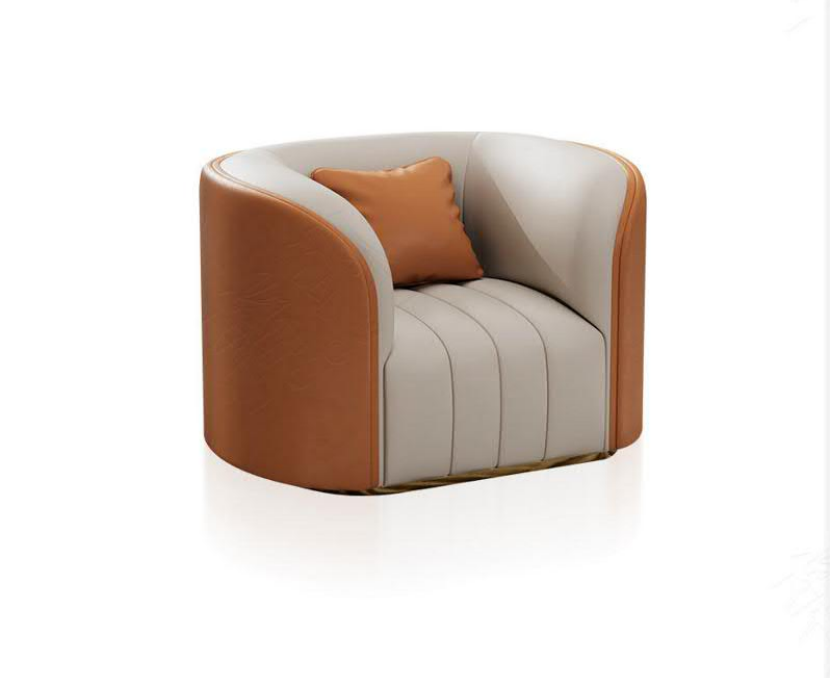 Introducing our Italian Modern Single Sofa Chair, a true designer piece. It features a striking two-tone genuine leather and high-grade technical leather combination, blending classic tan with elegant beige. The curved barrel shape provides exceptional comfort and a snug feel, supported by high-density foam for a soft sitting experience. This luxury accent armchair is the perfect statement piece for your living room, bedroom, or a high-end hotel club lounge area.