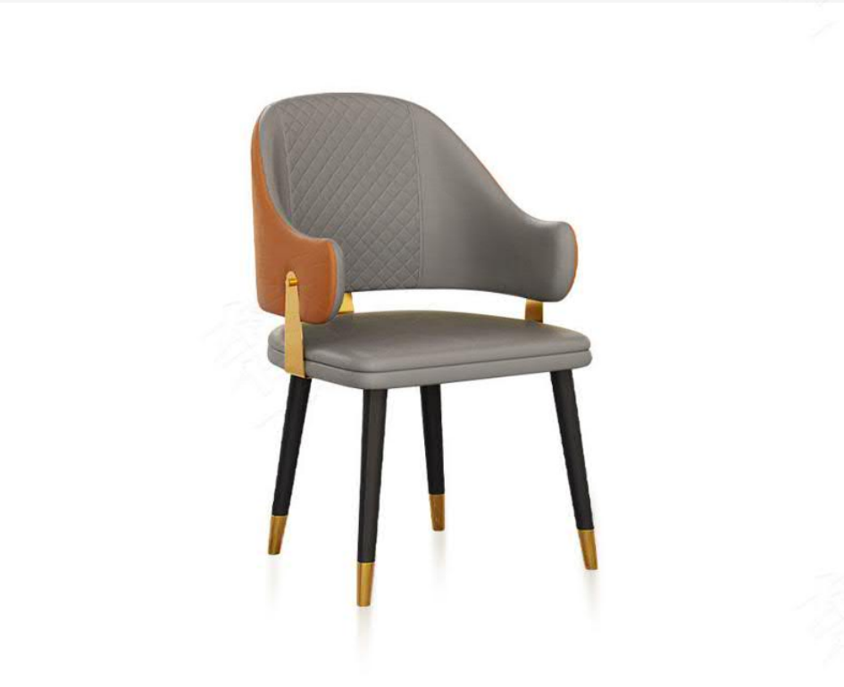 The chair is upholstered in soft Nappa leatherette, highlighted by a stylish two-tone design (grey and warm brown). High-resilience high-density foam ensures comfortable support. The sturdy iron art frame includes slim black legs tipped with elegant gold metal caps.This customizable leisure chair is ideal as a chic accent chair, dressing table seat, or as sophisticated seating for hotels, cafes, and business negotiation areas.