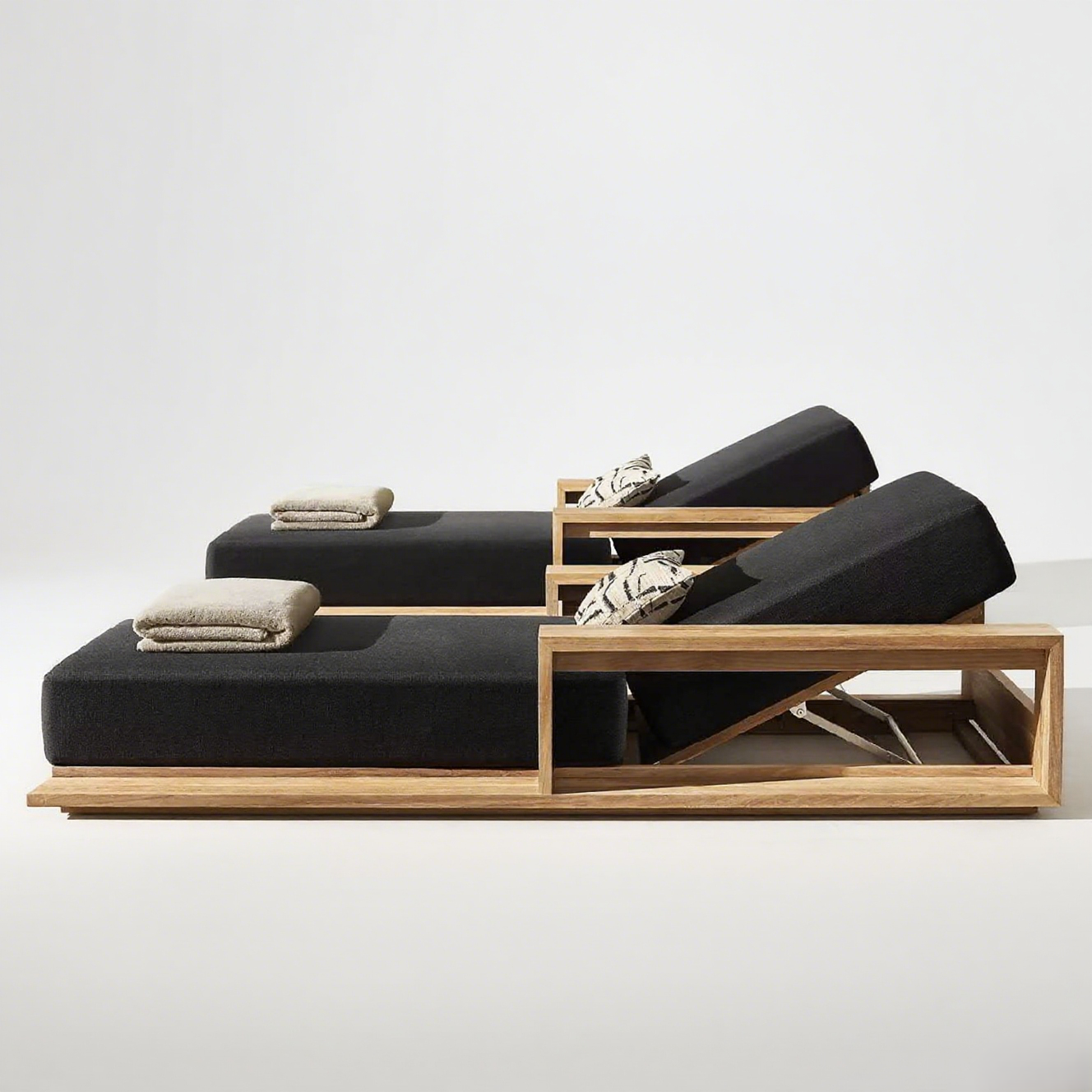 Garden Chaise Lounge Set Black Cushions, Wooden Frame