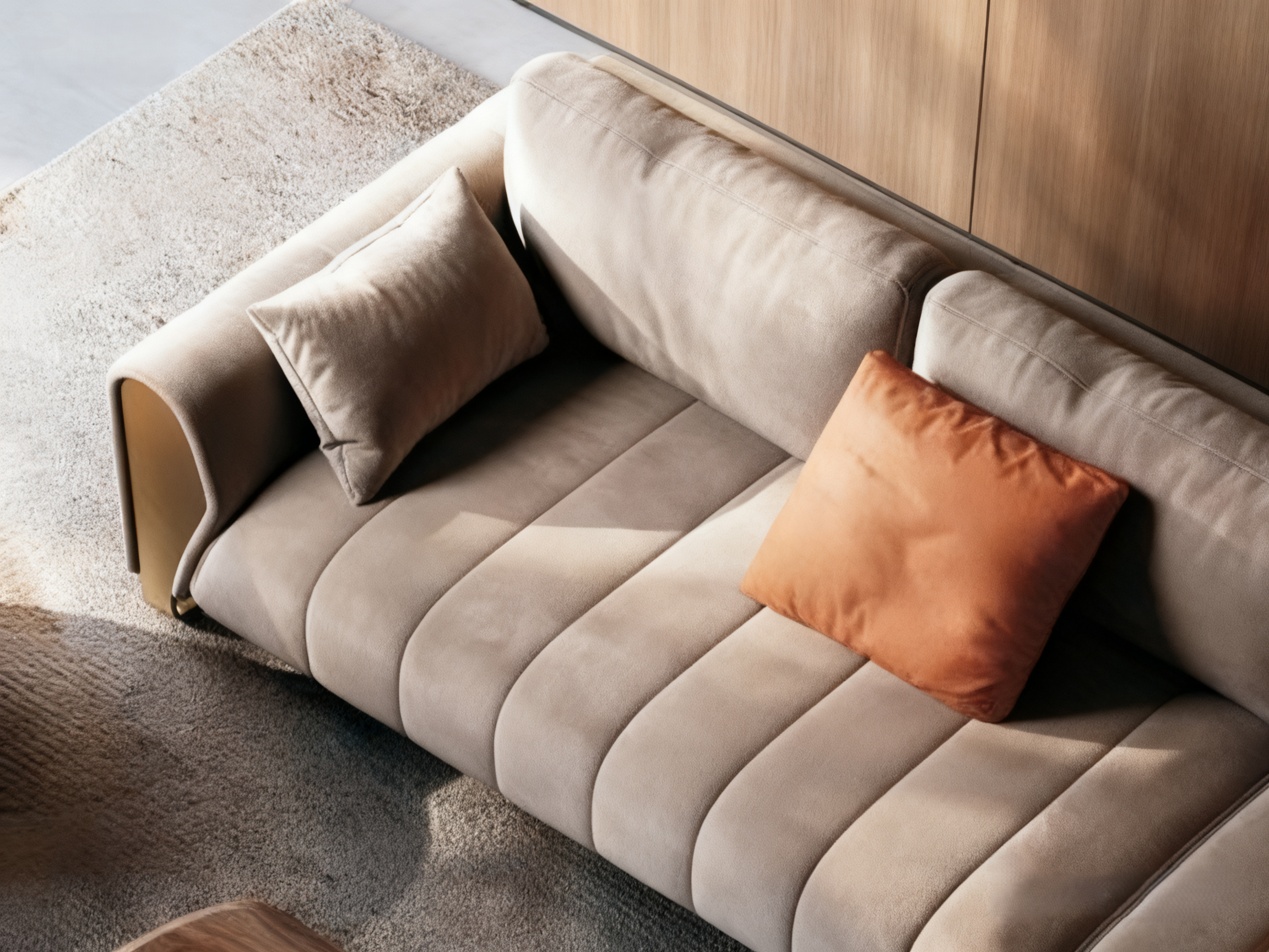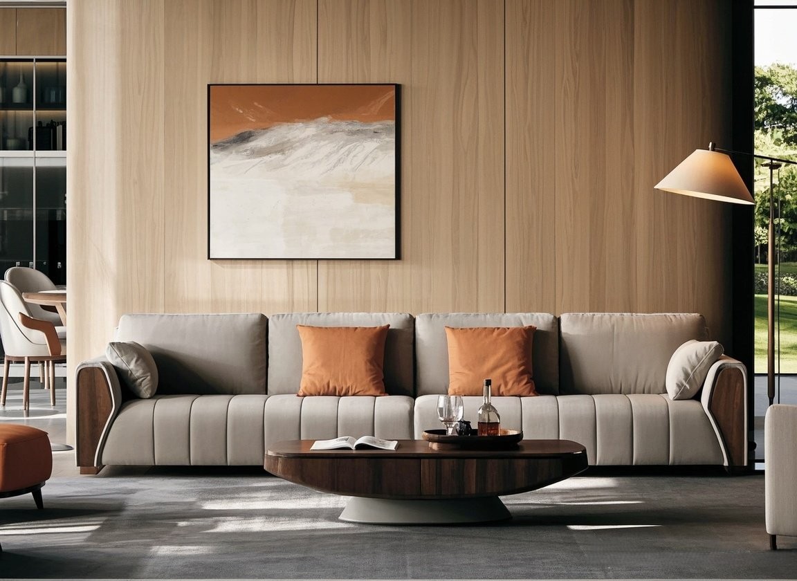 This sofa features a light gray main color with orange pillows, being simple yet vibrant. The leather is soft and skin – friendly, providing a comfortable sitting experience. The wooden armrest design adds a natural texture, blending with the overall modern style, which can easily enhance the style and warmth of the living room. It is an ideal choice for creating a comfortable home space.