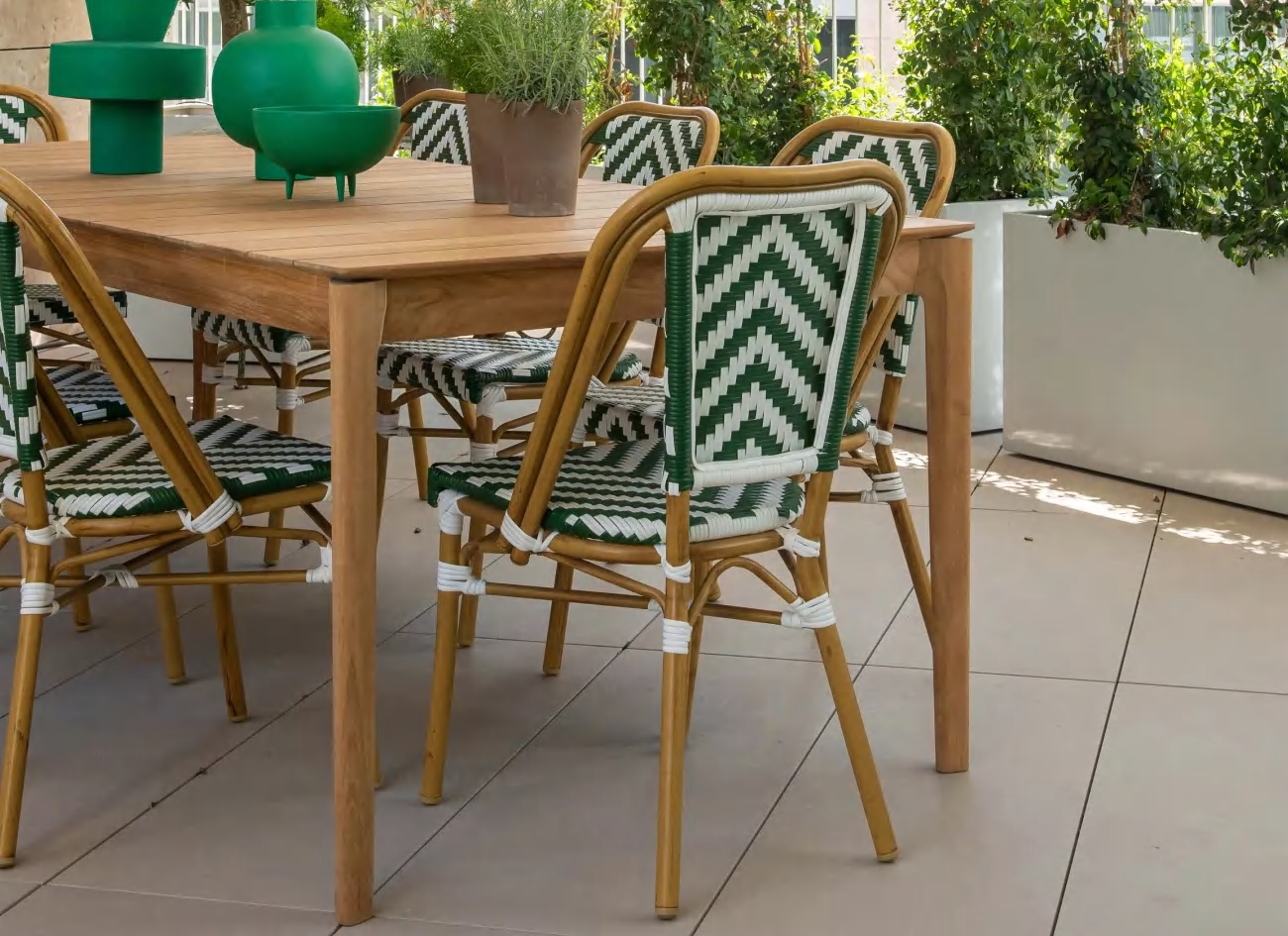The Modern French Collection showcases an elegant green and white chevron weave, meticulously handcrafted for sophisticated outdoor environments. Engineered with a rust-proof aluminum frame in a warm teak finish, this chair combines organic aesthetic appeal with long-lasting all-weather durability. The premium UV-resistant PE rattan and ergonomic silhouette make it an exceptional commercial-grade seating solution for hotel terraces, luxury resorts, and upscale restaurant gardens.
