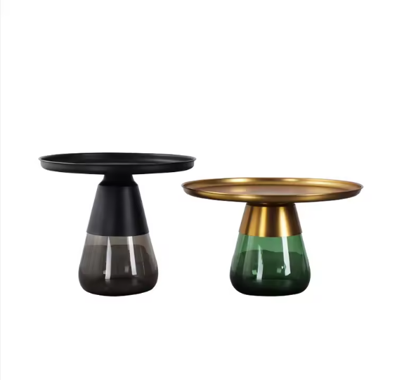 The Modern Luxury Collection side table seamlessly blends industrial metal with artistic translucent glass. Featuring a functional round metal tray top in gold or black finish, it is supported by a sculptural tinted glass pedestal base that catches and diffuses light beautifully. This contemporary accent table is a versatile addition to any luxury living room or bedroom, perfect for displaying decorative items or as a chic coffee station.